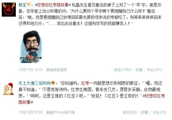 首先于12月3日通過好想你官微發(fā)起#好想你紅棗微故事#大賽活動,圍繞“好想你紅棗”創(chuàng)作情感微故事,并設一等獎(紅棗獎)1名,二等獎(洗澡獎)3名,三等獎(搓棗獎)10名,另有響應的獎品獎勵,提升參與者的積極性。然后通過@傳媒老王、@賴寶、@張錫磊、@全球熱門精選榜、@三峽在線、@木爾、@田桑、@東土大唐三俗和尚等大號或段子手轉(zhuǎn)發(fā)帶動人氣。