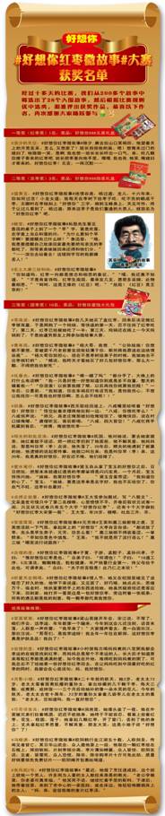 同時還進行了活動盤點,發(fā)布了《十大愛情故事》、《十大趣味故事》、《十大經(jīng)典故事》以及與好想你、紅棗或銷量領先結(jié)合最緊密的故事《十大最“好想你”故事》。最終@賴寶、@蒼南派、@東土大唐三俗和尚、@田桑等知名獲得相應獎項,而大部分獲獎作品都是網(wǎng)友原創(chuàng)作品,而非只選大V或段子手。