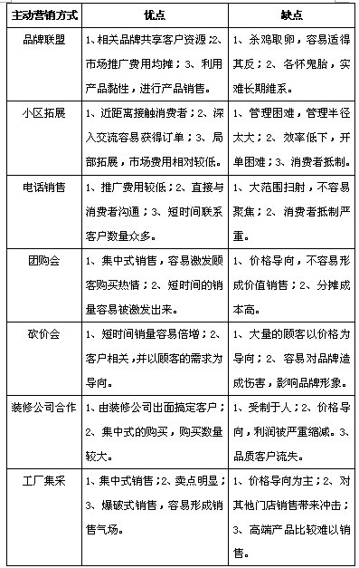 主動(dòng)營銷顧名思義就是化被動(dòng)為主動(dòng),采取積極主動(dòng)的措施實(shí)現(xiàn)銷售的過程。在家居建材企業(yè)比較常見的主動(dòng)營銷的方式有:品牌聯(lián)盟、小區(qū)推廣、電話銷售、設(shè)計(jì)師通路、裝修公司、團(tuán)購會、砍價(jià)會、工廠集采等方式。作為主動(dòng)營銷的最主要的特征就是,用積極的方法去主動(dòng)尋找和開發(fā)客戶,并最終達(dá)到成交的目的。