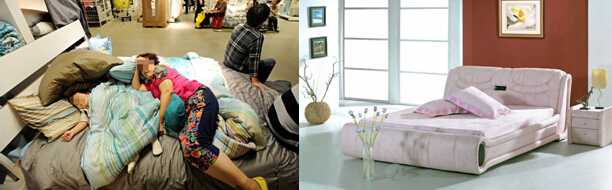 然而右邊這個(gè)家具店,看似很美,但卻無(wú)形中和消費(fèi)者拉遠(yuǎn)了距離。中國(guó)本土的家居店一般多以這種情況為主。為什么消費(fèi)者沒(méi)有坐在床上或者索性躺上去呢?可樂(lè)俠田新利認(rèn)為,至少有兩方面的原因:其一,該品牌沒(méi)有真正給消費(fèi)者一種完全放松的氛圍,并暗示大家這不是你的家而是賣場(chǎng),就算大家躺上去也會(huì)感到有些別扭。何況有些家具店赫然提醒大家:“注意衛(wèi)生,請(qǐng)勿躺臥”。因此,無(wú)論如何也親切不起來(lái)。其二,該品牌重在形式,并沒(méi)有將“體驗(yàn)”做到家。通俗的講,該品牌注重消費(fèi)者的視覺(jué),而忽略了他們的身心感受,沒(méi)有了產(chǎn)品與消費(fèi)者的身體親密接觸,又怎么會(huì)感到親切?
