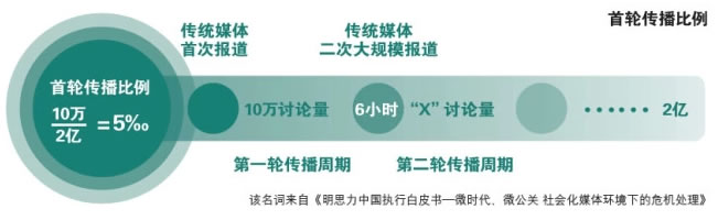 首輪傳播比例:某品牌的消費者總量大約2億,其負面事件被傳統(tǒng)媒體報道后,在6小時內(nèi)引發(fā)超過10萬條社會化媒體討論,進而引起傳統(tǒng)媒體大規(guī)模的二次報道。我們就認為第二波大規(guī)模媒體報道標志著危機正式爆發(fā),那么“第一傳播周期”的時間就要定義為6小時,而“第一傳播周期”的“首輪用戶傳播比例”就應(yīng)該定義在5‰(10萬除以2億)。這個數(shù)據(jù)不是一成不變的,而應(yīng)該隨著消費者數(shù)量的增加和每次危機的統(tǒng)計數(shù)據(jù)進行更新。