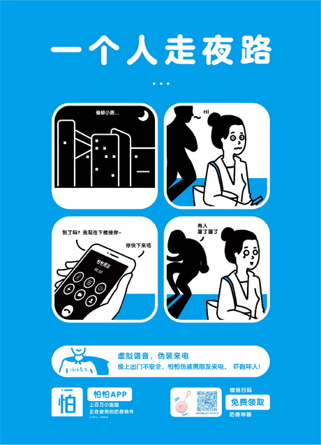 畫面勾勒了三個(gè)生活中常見場(chǎng)景小故事,分別是白領(lǐng)女孩下夜班回家路上被陌生男子尾隨,巧用怕怕APP的偽裝男友來電功能嚇退歹徒;時(shí)髦女孩獨(dú)自打夜車回家,被不良司機(jī)偷瞄還繞路,幸好有在怕怕APP上與男生分享實(shí)時(shí)位置,網(wǎng)約車司機(jī)知道自己的路線和車牌號(hào)已經(jīng)曝光遂放棄了圖謀不軌的念頭;女學(xué)生外出游玩獨(dú)自住經(jīng)濟(jì)旅館,半夜被敲門嚇得連喊”救命啊“,正是這聲”救命啊“觸了怕怕APP的語音報(bào)警功能,即使是凌晨怕怕客服仍舊第一時(shí)間通知女孩的多為親友及時(shí)展開救援。