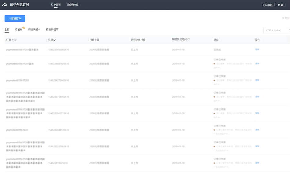 對(duì)于廣告主而言,僅需“建立需求訂單-選擇制作方-確認(rèn)腳本及視頻”的流程操作,便能高效體驗(yàn)視頻素材的制作。從需求溝通、協(xié)議簽訂、視頻制作到推送投放效果監(jiān)測(cè),均可在騰訊創(chuàng)意訂制一站式完成。所有的產(chǎn)品操作都能實(shí)現(xiàn)標(biāo)準(zhǔn)化、自動(dòng)化,過程便捷流暢。