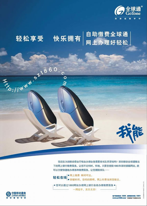 藍(lán)天,白云,一望無際的海灘,兩張沙灘椅,兩個鼠標(biāo),人性化地躺在沙灘椅上,很顯然感受到情侶間的溫馨,透射出浪漫的色調(diào)。網(wǎng)絡(luò)繳費,瞬間可打,體現(xiàn)全球通人輕松愉悅心情和開闊無限的境界。