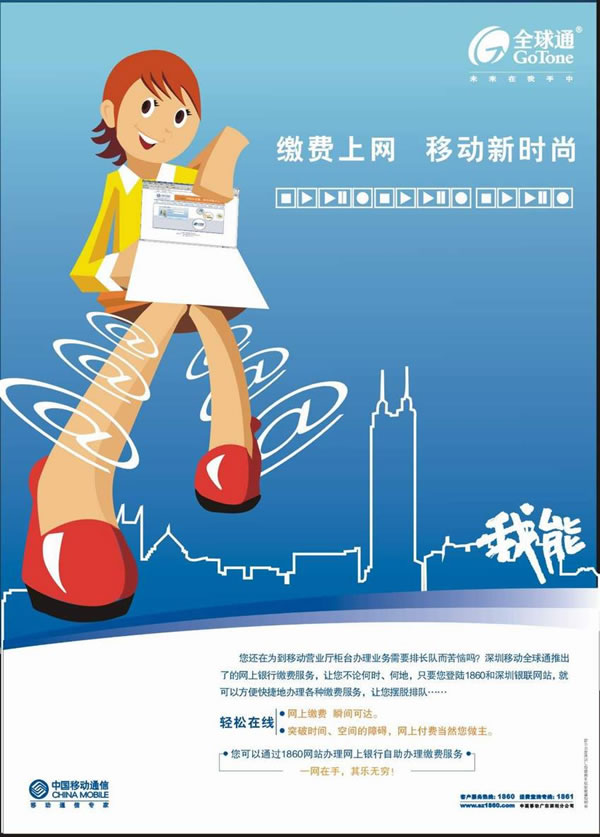移動新時尚,可以理解為移動公司的新時尚業(yè)務(wù),也可以理解為移動人們新的時尚觀念,引導(dǎo)人們的消費觀念。畫面采用時尚的卡通人們?yōu)橹鲌D,手握筆記本,展示1860網(wǎng)絡(luò)繳費平臺。而藍(lán)色背景更時尚,在配上@的網(wǎng)絡(luò)符號向外轉(zhuǎn)播,形象表現(xiàn)移動全球通業(yè)務(wù)的不斷拓展與開拓;播放器符號與深圳標(biāo)志的地王大廈等城市背景,映襯在主畫面之下,讓人感受到全球通客戶高端思想與緊跟時代潮流、品味生活時尚、用不停步的美好寓意。