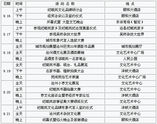 2005中國(guó)·滄州紀(jì)曉嵐文化節(jié)將于9月16日至21日舉行。文化節(jié)以“文化進(jìn)步與經(jīng)濟(jì)發(fā)展”為主題,以紀(jì)曉嵐為載體,弘揚(yáng)滄州文化,帶動(dòng)滄州經(jīng)濟(jì)發(fā)展,豐富市民生活,提升城市品位,圍繞文化、民俗、商貿(mào)三大活動(dòng)板塊,實(shí)施“形象、競(jìng)爭(zhēng)、品牌”三大策略,努力打造“紀(jì)曉嵐”文化品牌和滄州城市形象。