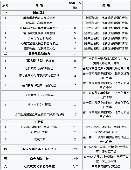 為了保證文化節(jié)的順利開展,多渠道籌集辦節(jié)經(jīng)費(fèi),同時(shí)利用辦節(jié)有利時(shí)機(jī)提升城市形象,擴(kuò)大商品知名度,促進(jìn)滄州與全國(guó)各地乃至世界各地的合作交流,推動(dòng)滄州經(jīng)濟(jì)快速發(fā)展和社會(huì)全面進(jìn)步。本著“社會(huì)參與、市場(chǎng)運(yùn)作”的原則,組委會(huì)熱忱歡迎社會(huì)各界積極支持和參與,F(xiàn)將招商事項(xiàng)公告如下: