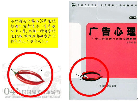 想不到的是,2004年的成都美食節(jié)居然使用了這樣的一個一摸一樣的設計,筆者實在不明白這位設計者怎么會“借鑒”到了如此地步,在筆者看來,這似乎真的沒有必要。