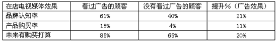 最新的一份TNS對(duì)沃爾瑪在店電視聯(lián)播網(wǎng)的效果進(jìn)行調(diào)查后顯示,在店電視媒體對(duì)品牌形象提升及購買率的提升均有良好的效果。根據(jù)這份調(diào)查,在沃爾瑪里的消費(fèi)者,觀看到在店電視商品廣告之后,認(rèn)可該品牌的占61%;而沒有觀看到該廣告的認(rèn)可率為40%;觀看到在店電視商品廣告之后立刻購買該商品的占15%,而沒有觀看該廣告的購買率為4%;觀看到在店電視商品廣告之后,未來有購買該商品打算的占85%,而沒有觀看在店電視廣告的未來購買率為62% ,見下表: