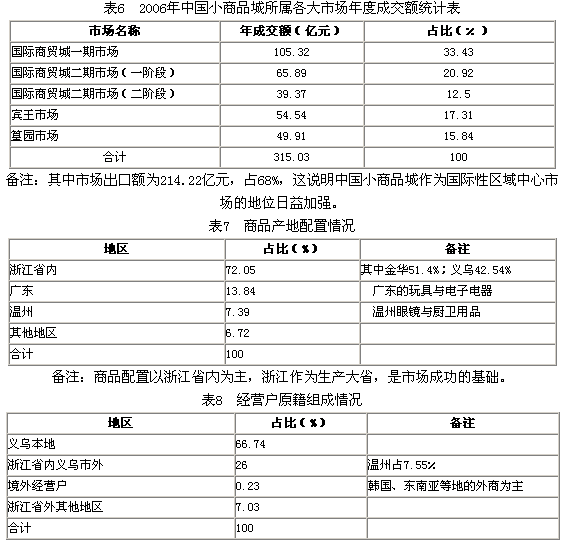 中國小商品城創(chuàng)建于1982年,是我國最早創(chuàng)辦的專業(yè)市場之一。25年來,經(jīng)歷五次搬遷九次擴建,現(xiàn)擁有營業(yè)面積260萬平方米,由中國義烏國際商貿(mào)城、篁園市場、賓王市場三個市場簇群組成,商位58000余個,從業(yè)人員10萬多,日客流量20多萬人次。2006年市場總成交額達315.03億元,其中外貿(mào)出口占60%強,自1991年始連續(xù)16年位居全國工業(yè)品批發(fā)市場榜首。