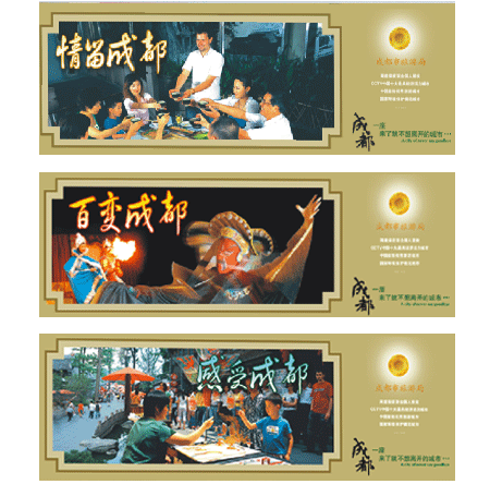 1.最完整全面地含概了各種有代表性的成都元素,實現(xiàn)了完全意義上的優(yōu)化組合,而且通過主畫面構圖凸現(xiàn)了各個不同的宣傳主題。