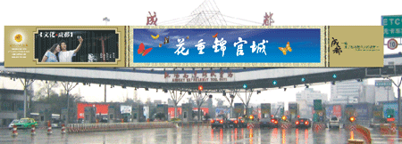 我們選擇進出成都最重要的交通口岸所有高速路收費站頂作為本次廣告的主要傳播載體,但我們發(fā)現(xiàn)面對的各收費站頂的廣告牌位高立狹長,嚴重限制著廣告的表現(xiàn)容量和表現(xiàn)形式!!如果減少信息容量,廣告牌位面積太小,則不但容易失卻大氣,影響城市形象,而且也會因為人車過境時間的有限性而導致行銷效果的孱弱;如果豐富信息容量,則畫面構成混亂——這似乎是一個兩難到難以解決的困局!