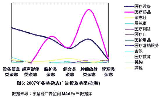 從廣告投放產(chǎn)品來看,藥品根據(jù)其功能主要投放在腫瘤放射、監(jiān)護(hù)和綜合類型的雜志上,設(shè)備信息類和管理類雜志少有涉及;而醫(yī)療設(shè)備廣告則是在設(shè)備信息類雜志上投放最多,其次則是在超聲影像類、監(jiān)護(hù)類雜志上有目的有針對(duì)性的投放(見圖6)。