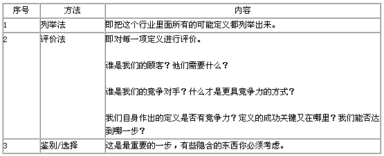 一個(gè)企業(yè)可以通過(guò)以下三個(gè)具體的步驟來(lái)定義它的行業(yè)。
