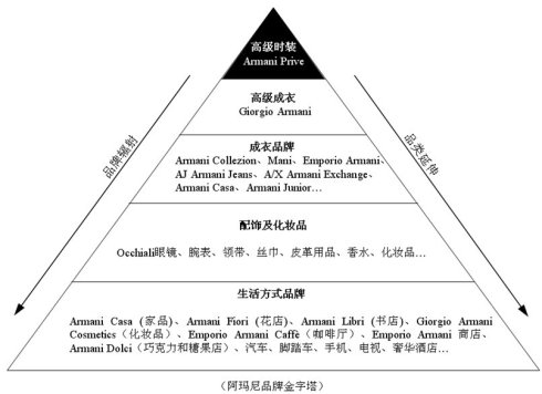 塔,才能使品牌豐滿有力。在阿瑪尼品牌系列中,從二三十萬人民幣一套的高級訂制時裝Armani Prive系列,到一套西裝三萬人民幣左右的Giorgio Armani,再到數(shù)百元的阿瑪尼低價品牌系列,產(chǎn)品定位由高到低排列了十幾個定位不同的副品牌。這些品牌有各自明確清晰的品牌定位,以便顧客區(qū)分。并采取了不同的渠道種類以防品牌間相互沖突。另一方面,品牌間又保持著某種聯(lián)系。無論是Giorgio Armani的高端奢侈、Armani Collezini的端莊淡雅、 A/X的年輕時尚,還是Armani Jeans的大眾休閑,它們又同時奇妙地保有了“阿瑪尼品牌”的特有設(shè)計(jì)精髓。阿瑪尼除進(jìn)行品牌延伸之外,經(jīng)營品類也進(jìn)行了的廣泛延伸,從各種服飾及配套產(chǎn)品一直延伸到各種生活用品,直至進(jìn)入食品、汽車、酒店業(yè)。阿瑪尼現(xiàn)在已經(jīng)從一個單純的時裝品牌成功地轉(zhuǎn)型為一個完整的時尚奢侈生活方式品牌。只要消費(fèi)者喜歡,他們一天24小時都能接觸到阿瑪尼的產(chǎn)品和服務(wù)。