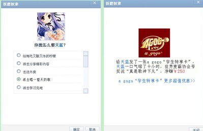 經(jīng)過綜合效果評(píng)估,我們選擇和對(duì)青少年用戶粘性最強(qiáng)的騰訊QQ進(jìn)行合作:將a gogo“學(xué)生特享卡”植入到QQ用戶的“好友買賣”游戲中,從而吸引用戶主動(dòng)參與,這樣更能激發(fā)他們的購買欲望,引導(dǎo)消費(fèi),刺激消費(fèi)。