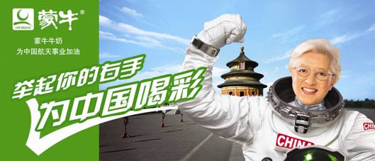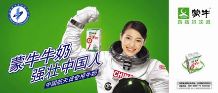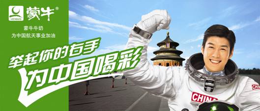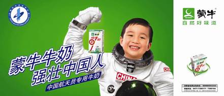 強(qiáng)化產(chǎn)品訊息——“蒙牛牛奶,中國(guó)航天員專用牛奶”,將中華民族的強(qiáng)壯和因牛奶使人體強(qiáng)壯聯(lián)系起來。中國(guó)加油,蒙牛牛奶永遠(yuǎn)支持中國(guó)航天事業(yè)!