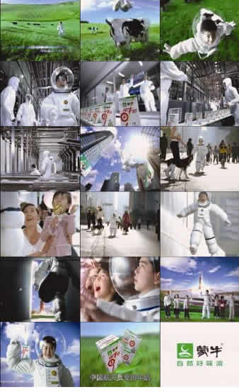 創(chuàng)意表現(xiàn):在前一階段宣傳中,“蒙牛牛奶——航天員專用牛奶”的概念已深入人心,我們需要進(jìn)一步闡釋蒙牛牛奶成為中國(guó)航天員專用牛奶的理由。所以廣告片中,我們以希望成為強(qiáng)壯航天員的一個(gè)小孩為連接點(diǎn)來表現(xiàn)蒙牛草原、工廠、工藝流程等優(yōu)勢(shì)。