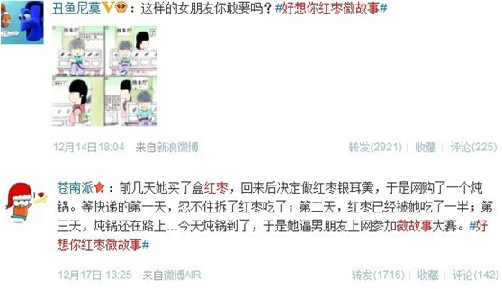 “好想你”是大眾詞匯,直接說好想你,難以聯(lián)想到紅棗,但“紅棗領導品牌”又太長,影響話題傳播,綜合考慮最終用#好想你紅棗微故事#作為話題,進行段子營銷。