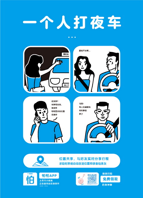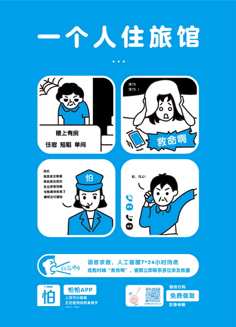 畫面勾勒了三個(gè)生活中常見場(chǎng)景小故事,分別是白領(lǐng)女孩下夜班回家路上被陌生男子尾隨,巧用怕怕APP的偽裝男友來電功能嚇退歹徒;時(shí)髦女孩獨(dú)自打夜車回家,被不良司機(jī)偷瞄還繞路,幸好有在怕怕APP上與男生分享實(shí)時(shí)位置,網(wǎng)約車司機(jī)知道自己的路線和車牌號(hào)已經(jīng)曝光遂放棄了圖謀不軌的念頭;女學(xué)生外出游玩獨(dú)自住經(jīng)濟(jì)旅館,半夜被敲門嚇得連喊”救命啊“,正是這聲”救命啊“觸了怕怕APP的語音報(bào)警功能,即使是凌晨怕怕客服仍舊第一時(shí)間通知女孩的多為親友及時(shí)展開救援。